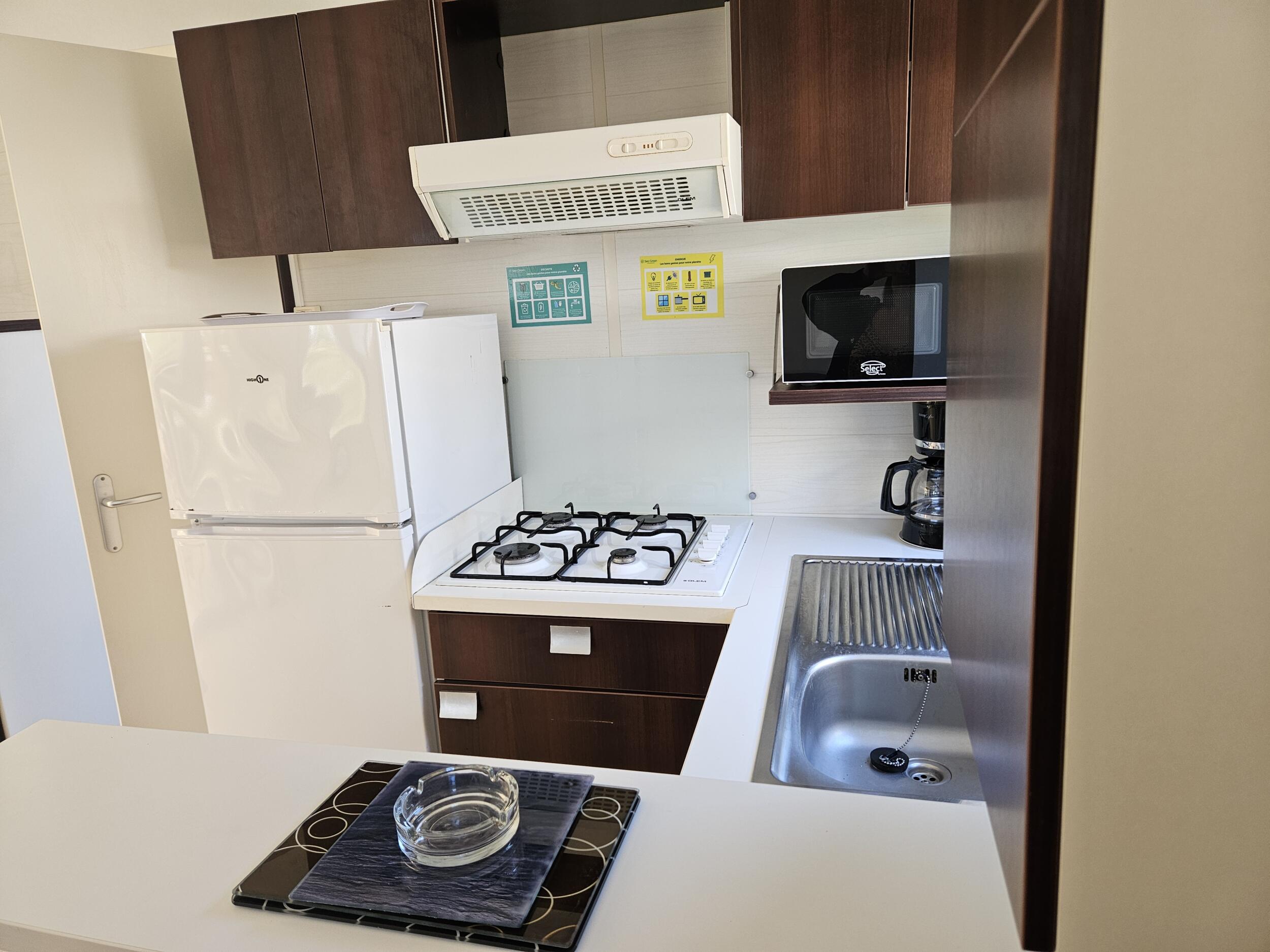 Open keuken uitgerust met huishoudelijke benodigdheden.