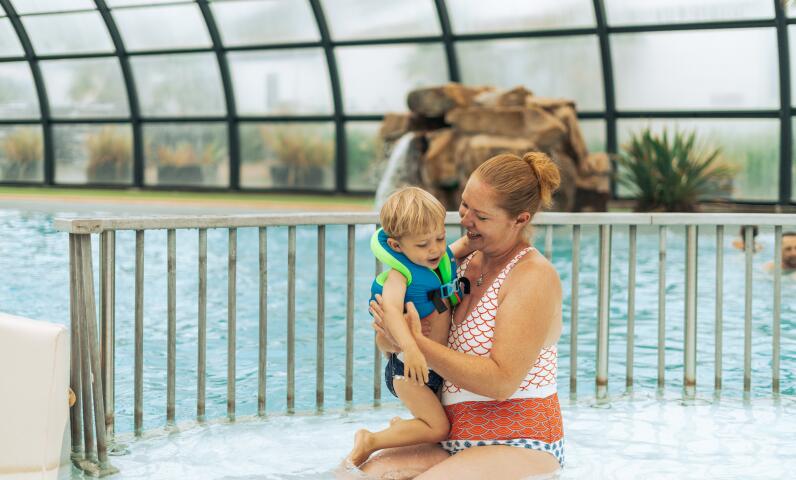 Omgeven door een kunstgrasstrand, palmbomen, groene eilanden en watervallen, beschikt het zwembad van onze 5-sterren camping over een groot zwemgedeelte, meerdere waterglijbanen en wellnessfaciliteiten zoals massagejets en een whirlpoolbank. Het glazen dak biedt natuurlijk licht en een panoramisch uitzicht naar buiten. Op mooie dagen gaat het dak open, zodat zwemmers kunnen genieten van de frisse lucht en de zon.